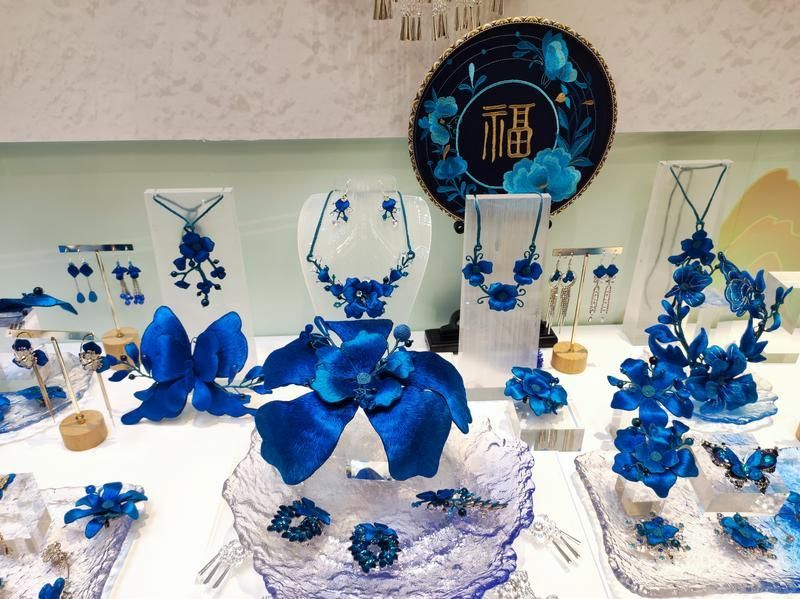 回国后,陈国桃立刻投入研发。由此诞生的“蓝色系列”苗绣首饰,一直被围观,常常卖断货。近日,中青报·中青网记者在一个非遗展览上遇到陈国桃时,她正被举着手机扫码支付的观众围得严严实实。“这种蓝色是我们的独家发明,有苗药的成分。由于是手工制作,不同批次的蓝色会有细微差别,这也正是非遗的魅力。”