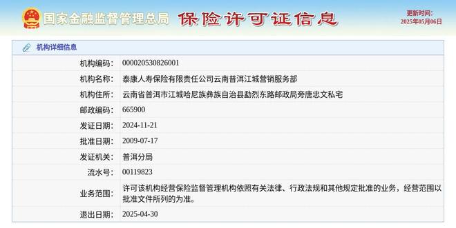 beat3655月6日,根据国家金融监管总局保险许可证信息,泰康人寿保险有限责任公司云南普洱江城营销服务部获准退出,退出日期2025年4月30日。